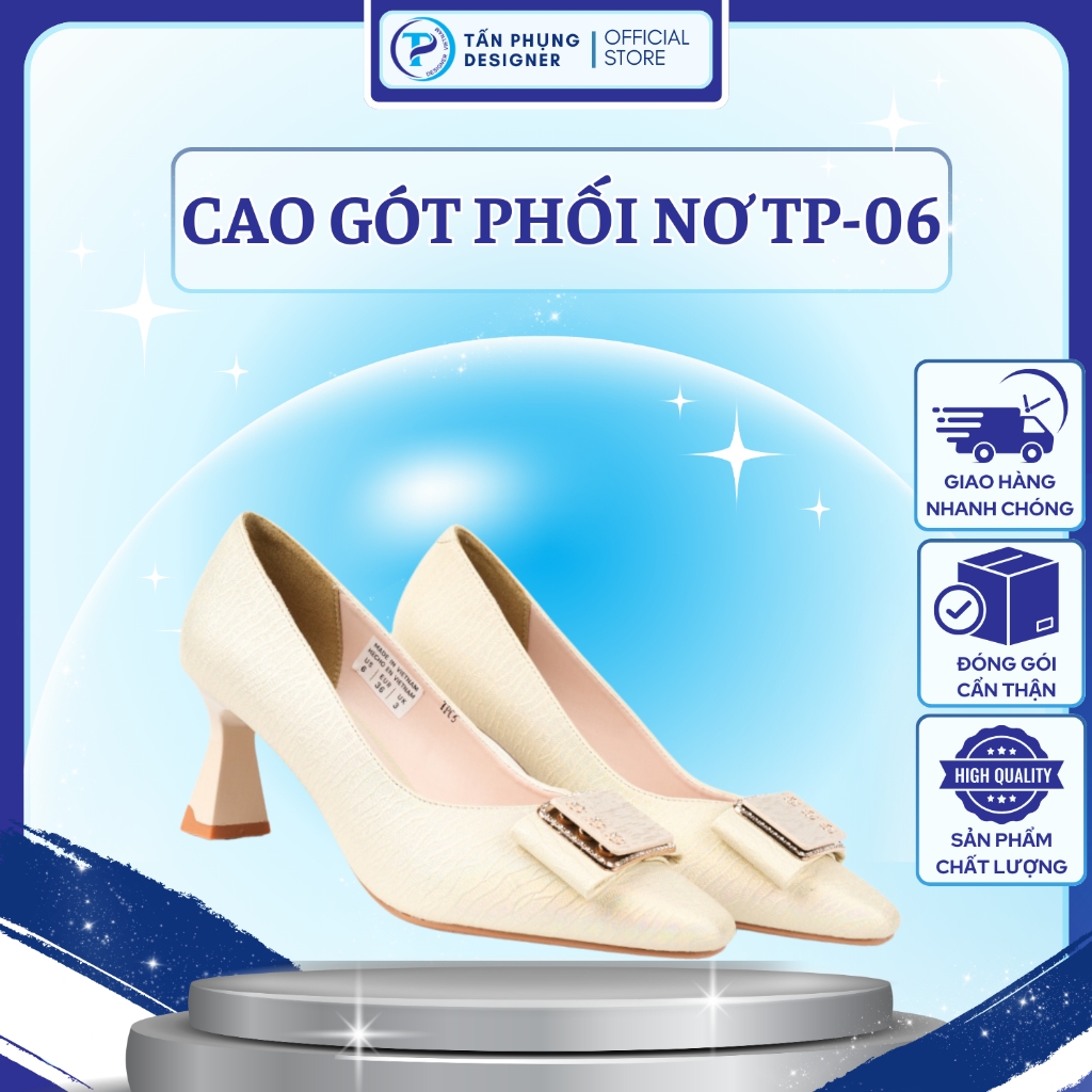 MÔ TẢ SẢN PHẨM – Thương hiệu: TẤN PHỤNG Designer. – Sản xuất: Việt Nam. – Kiểu dáng: Giày cao gót. – Màu sắc: Đen, trắng, kem. – Độ cao gót: 6 cm. – Đế: TR Chống trơn, trượt. – Size: 35 - 39. – Chất liệu: Da tổng hợp cao cấp nhập khẩu Microfyber. – Trọn bộ sản phẩm gồm: 01 đôi giày nữ thời trang cao cấp TẤN PHỤNG Designer + Thẻ bảo hành + Thư cảm ơn + Túi đựng giày chống ẩm, chống lão hóa + 01 hộp đựng sang trọng. – Bảo hành: 06 tháng (với lỗi do sản xuất).